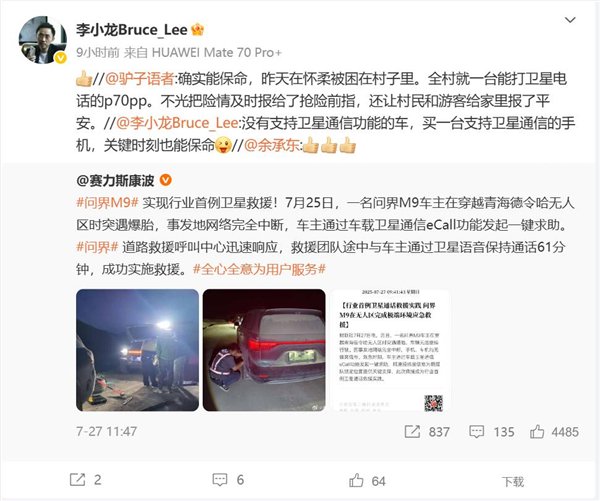快科技7月29日消息,有网友给华为Mate之父李小龙留言称,卫星通信手机确实能保命,因暴雨他被困在村子里,全村就一台能打卫星电话的Pura 70 Pro+,不光把险情及时报给了抢险前指,还让村民和游客 ...